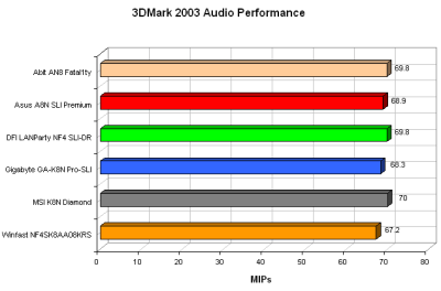 3DMark 2003通过运行WW2 fighter来测试音频系统,我们就用它来测试这几款主板的音频解决问题方案。