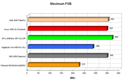 除了富士康Winfast外,其他的主板的FSB值都相当高,DFI LANParty 打败了升技,而成为这次测试的冠军。