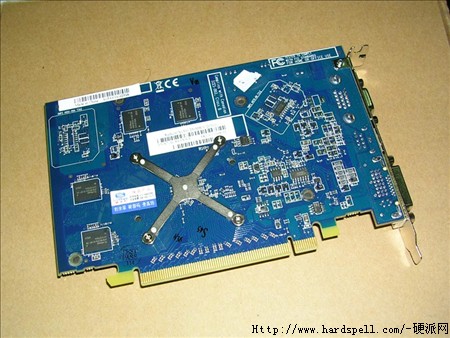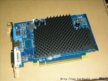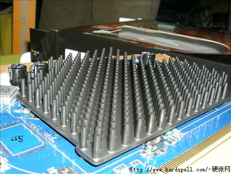 显卡采用了静音设计,一枚巨大的黑色散热片将显卡基本覆盖,我们可以在散热片的表面看到大量的突起点,以增加显卡散热片的散热面积,再配合显卡选进的制程工艺,使得这款显卡要以在完全静音的效果下工作。