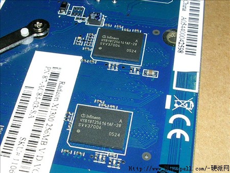 我们可以看到,蓝宝的这款X1300显卡采用了静音设计,由于X1300显卡被区分为三个版本,而显然这款蓝宝的静音版应该属于标准版了。显卡核心采用了基于全新的90nm的制程工艺,所以这使得显卡的散热性能更好,这也是这款显卡可以采用静音设计的原因之一。显卡采用了2.8ns的GDDR2显存颗粒,显存容量也达到了256MB,显卡的出厂频率为:450/500Mhz,看来还有不小的超频空间。