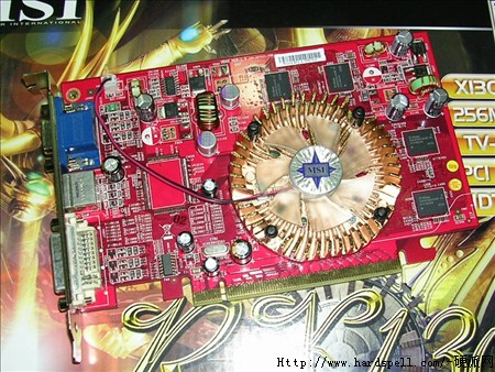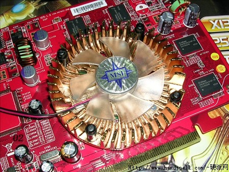 在散热方面,我们依旧看到的是微星特有的大号主动式散热风扇,由于显卡核心采用了更加先进的90nm工艺,所以这款显卡的核心虽然达到了惊人的600MHz频率,但却只需要这样的散热模块就可以解决显卡的散热问题。
