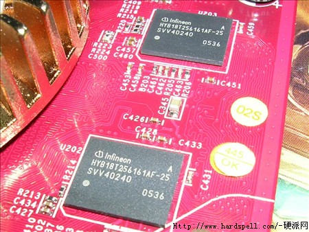 显存方面这款显卡使用了目前比较流行的英飞凌2.5ns的GDDR2显存颗粒,由显卡正反面共八颗这样的显存颗粒,组成了显卡256MB/128bit的显存规格,显卡的核心/显存默认频率也达到了惊人的600/800MHz。