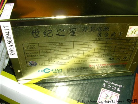 从铭牌上我们可以看到这是一款符合ATX 12V 1.3版标准的电源,电源的额定功率为350W,最功率为480W。其中+12V达到22A,完全可以满足目前主流平台的应用,另外这款电源通过了国内强制实行的3C认证。