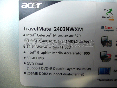TM2403采用的是C-M 1.5GHz处理器、256MB DDR2内存、Intel 910GM芯片组、60GB硬盘、DVD刻录光驱,整机重量约为2.4Kg左右。