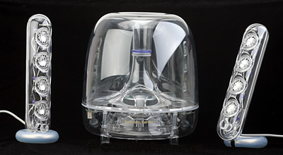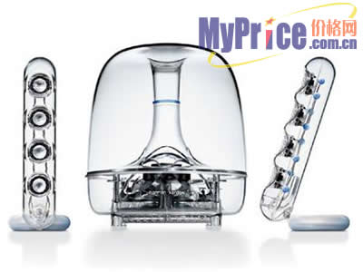 Harman/kardon SoundsticksII通体采用透明的有机玻璃制造,晶莹剔透,内部。她的低音炮采用6英寸的扬声器,传统的倒相式设计,倒相孔设计在音箱的上部有别于大多数设计在后面的产品。低音单元采用了独特的回路进出,使低频深沉有力,低频调节旋钮设计在低音炮的后面。卫星音箱由四个1英寸的音频单元构成,设计为手触式音量调节,方便时尚。