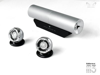 漫步者音箱在国内用户中有着良好的口碑,这款M3就是漫步者转为笔记本推出了多媒体音箱。圆柱型的铝管低音炮和两个小巧的卫星音箱组成了M3的全部,如果和笔记本搭配在一起显得精制利落。而且低音炮的造型更是名实相符,很像一门火药上膛的大炮。