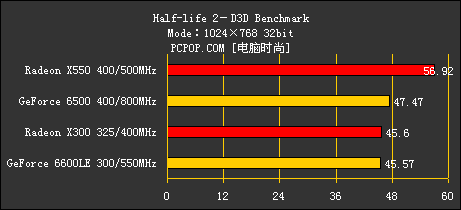 众所周知,Half Life 2对于显卡的频率要求非常高,因此从测试中我们看到,400/800MHz的GF6500也会高于300/550MHz的GF6600LE。而本身又是对A卡优化的游戏,X550高居榜首也是在情理之中的事情了。