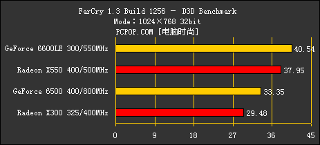 在FarCry测试中,成绩排名依次为GF6600LE、X550、GF6500以及X300,它们之间的差距都不是很大。