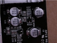 显卡供电部分用料虽然不是很奢华,但也很不错了。雷霆X550使用了两颗1500微法的大容量贴片电容;昂达雷霆X550初使设定水准比较高,没有采用400MHz的核心设定,而是直接拉到450MHz,显存采用三星DDR显存颗粒,时钟周期4ns,运行频率500MHz。