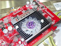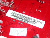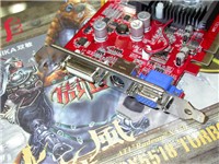 显卡型号为双敏火旋风PCX5518 TURBO 傲世限量版,整体采用火红色PCB,基于ATI 中低端的主流产品X550显示核心,显卡采用风扇加散热片组合,主动方式散热。有效的保证了显卡的稳定运行,并且对显卡的超频起到了辅助的作用。显存方面是出自现代的3.6ns DDR显存颗粒,全部搭载在显卡正面,组成了双128的显存规格,即显存容量128MB,显存位宽128Bit。显卡出厂默认核心/显存工作频率在450MHz/550MHz,有能力的用户回去可以继续“开发”。显卡提供了DVI/VGA/TV-OUT三接口输出,能够方便用户的使用。