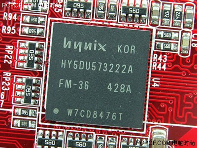 显存采用了现代原厂mBGA颗粒,速度3.6ns,运行频率550MHz。显存仍然让我们感到了相当的性能上升空间,轻松提过600MHz水准,在我们的残酷的超频测验下,稳定在620MHz依然有着良好的表现。