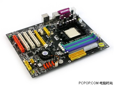 主板型号为K8N Neo4-F,采用黑色PCB配合各种插槽颜色看起来五颜六色,让人清晰可辨。主板采用NF 4标准版单芯片设计,能够支持939针的AMD系列处理器。拥有800MHz的HT总线,覆盖芯片组的黑色散热器想必是经过微星精心的打造而来,散热绝对不成问题。主板采用三相回路供电,使用了封闭电感,而且拥有低电压及过流保护功能,让用户使用起来更为稳定、安全。