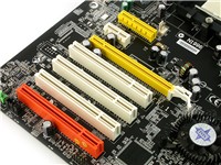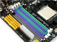主板提供了1个PCI-E X16,1个PCI-E X4和一个PCI-E X1插槽,我们仔细观察一下主板的PCI-E X4 并没有完全封闭,这样我们也可以来组建Xli显卡平台,这种技术类似于SLI,这里笔者就不多说了。内存方面,主板提供了4条插槽,最大可支持4GB DDR400内存,通过整合在处理器内部的控制器,可以实现内存双通道。