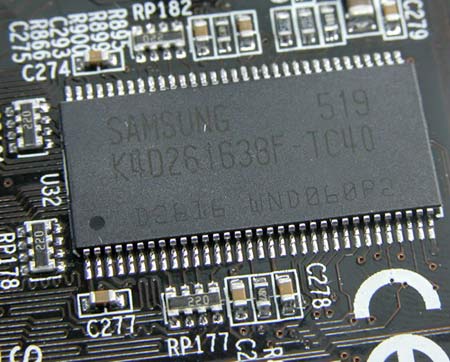 图形芯片基于RV370核心,内建4条渲染管线,2个顶点着色处理器,采用0.11微米制程,默认运行频率设置为400MHz。显存采用了原厂三星TSOP颗粒,速度4ns,运行频率500MHz。