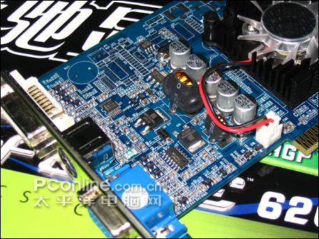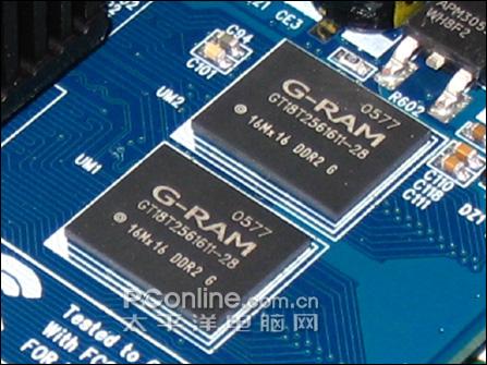 显存采用的是G-RAM 2.8ns DDR2显存颗粒,显存规格为128M/64bit,默认显存频率为700MHz。