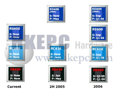 除了K8芯片组市场外,ATI亦将会投放不少资源于Intel芯片组市场上,现时ATI共有两款芯片组包括RS400及RC400,两者同样拥有RADEON X300绘图核心,分别在于RS400拥有DUAL CHANNEL内存控制器,而RC400只支持SINGLE CHANNEL内存控制器,主攻低端及流动计算机芯片组。而RC400的最新改良版本RC410也将陆续上市,RC410不单在制作成本上大幅下降,而且亦改良了显示核心的效能,同时亦会为Intel平台推出支持CROSSFIRE技术的RD400芯片组。