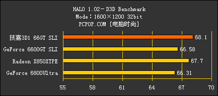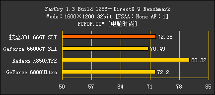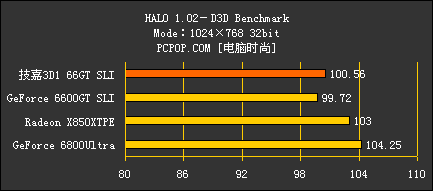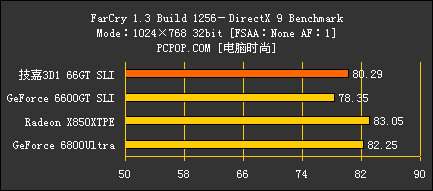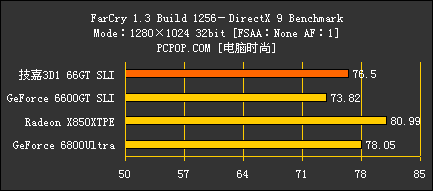 从对技嘉3D1的测试来看,不论在3DMark03、05以及后面进行的游戏测试中。3D1表现出来的性能都没有让大家失望,与两片GeForce 6600GT组成的SLI系统相比,3D1始终保持了对双卡的领先。而且性能上也超出了GF6800Ultra、X850XTPE这样的顶级单卡。