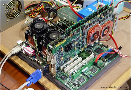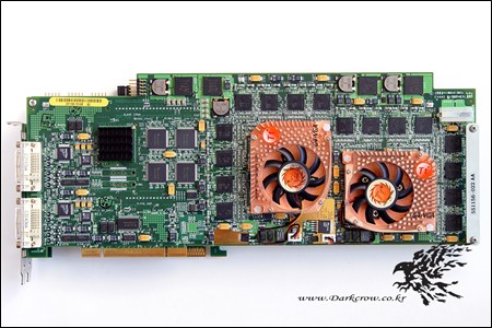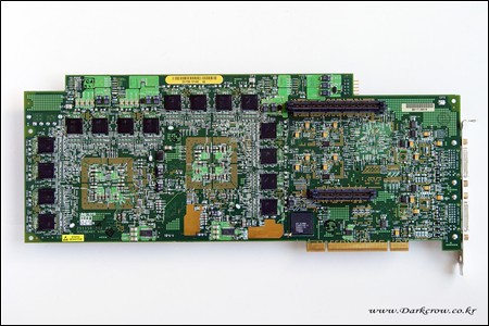 最后要提的一款产品名为simFUSION 6000/6500,是一款针对工作站应用的显卡,其采用了4颗9800/9800XT图形芯片,看上去相当恐怖。由于设计异常复杂,该显卡只能采用两块PCB,上面布满了显存、电容等元件。