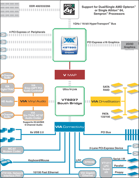 K8T890是威盛在K8平台上推出的主力选手,这款芯片组延续K8T800芯片组发展而来,主要是增加了对PCI Express平台的支持。下图是VIA K8T890芯片组的结构图,通过这张图我们可以看出,这款芯片组几乎支持所有的主流规格配置。