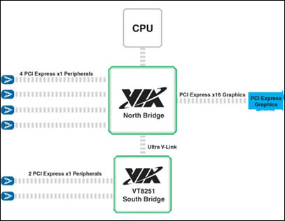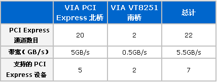 VIA的Flex Express架构允许多设备配置,通过最高22条PCI-E通道,可以在最高5.5GB/s的带宽上支持7个PCI Express设备。