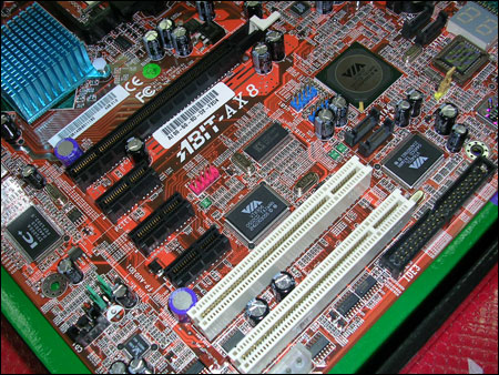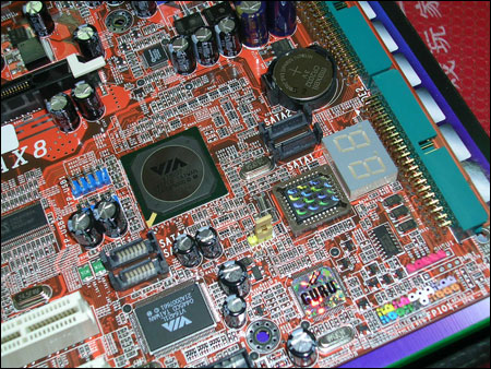 该主板带PCI-Express X16的主流显卡接口,3条PCI-Express X1接口,2条PCI接口,板载Debud故障诊断指示灯。这款主板的IDE接口比较有特色是倒放的,VT8237R带2个SATA接口,但该主板带板载了其它芯片,又支持2个SATA接口和1个IDE接口,全部支持Raid功能。