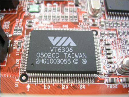 主板上集成的网络芯片是大家比较少见的IC Plus1000A千兆自适应网络芯片。音效芯片为ALC658,也是比较少见的,提供6声道音频输出支持。此外还集成有VT6306 IEEE1394a控制芯片,提供了1个1394a接口。