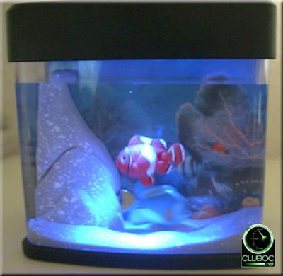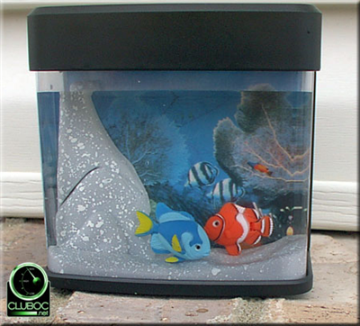 你可以使用两节AA电池给鱼缸内的LED彩灯供电,还可再加两节打开水泵,两条小鱼会随着水流游动,看起来就像是真的鱼了。