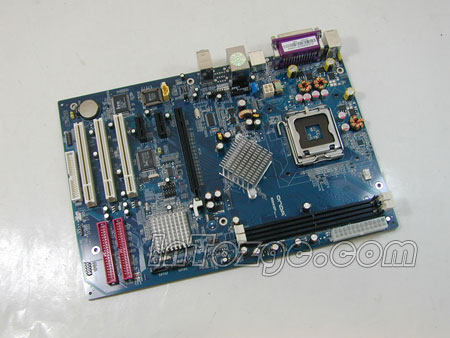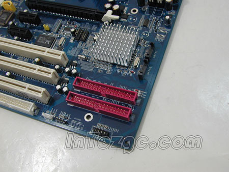 昂达RXC410T主板采用RXC410+SB450的南北桥搭配,标准的大板设计,虽然RXC410芯片使用了先进的110纳米制程,低功耗低发热量,但一块散热片还是有必要的,尤其在长时间游戏的过程中,北桥的发热量会上升很快,这种Intel官方推荐的矩阵散热片对系统的持续稳定运行会起到帮助。