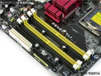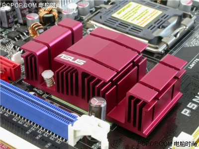 华硕在散热方面花了很多的心血,这也是他一如既往的风格,尤其是在SLI主板上,散热问题就更为明显了。P5ND2-SLI Deluxe上有的铝制散热片,而且散热片上还标有ASUS的标,表示它是主板不可缺少的东西,而且噪音很小。nForce4 SLIIE上还有个红色的散热片,表明它的散热能力。不过,在我们的测试过程中,发现它还是很烫。