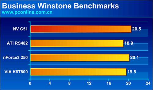 Business Winstone 2004是Futuremarks公司推出的一款权威性测试软件,它主要通过Excel、Dreamweaver、Outlook Express等常用商业办公软件来测试PC的整体性能和多任务处理能力,以上是几款不同芯片组在Business Winstone中的表现,4者之间性能都相当接近,但是从对比图表我们可以清楚看出,NV C51的性能是稍占优势的,从而更加锻造了其良好的