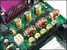 主板I/O部分,集成了一颗Realtek百兆以太网数模转换芯片和Realtek RLC655音效芯片,主流功能,能满足一般用户的使用需要。