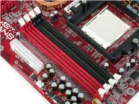 主板提供了1个PCI Express x16插槽,3个PCI插槽;内存方面,主板提供了四条184-pin DIMM 插槽,支持双通道 DDR400/333/266 non-ECC un-buffered 内存(最大4GB)。