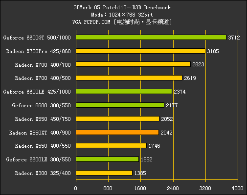 通过规格对比可以发现,X550XT采用了与X700系列相同的RV410核心。渲染管线部分由8条缩减为X550系列标准的4条,但顶点引擎数量却保持了6个,规格上较之前X550显卡略有提升。并且,ATI同样没有控制各家X550XT的默认频率,厂商可以根据各自板型、用料选择显卡频率。因此,其性价比较高也是在情理之中的事情了。