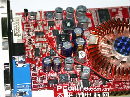 供电电路密集分布在显卡正面的左边,采用了日本红宝石电解电容、防暴的铝壳电容,低干扰的密封式电感盒体现出该卡在布线做工上下了很大的功夫,也为显卡的稳定运行提供了保障。