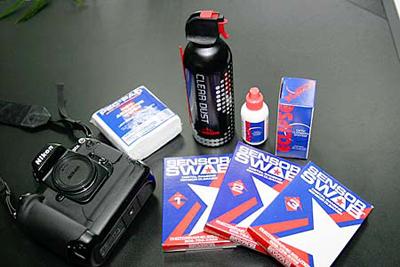 由于使用单镜反光相机经常要更换镜头,所以CCD/CMOS如尘问题就成为DSLR用户最大的苦恼。目前除了将DSLR送维修部保养清理外,最好的解决方法就是使用SENSOR SWAB(CCD/CMOS)清洁棉棒TYPE 2(SENSOR SWAB清洁棉棒分为多种类型,其中TYPE 2适用于佳能EOS 350D、EOS 20D、尼康D50、D70s等采用APS-C规格CCD或者CMOS的DSLR使用)以及ECLIPSE光学镜片清洁液来对CCD或者CMOS进行清理。在镜头的清洁方面,则可以使用ECLIPSE光学镜片清洁液加PEC*PAD无尘清洁布以达到最好的清洁效果。虽然这样的清洁方式非常有效,而且也免去了将DSLR送到维修部清理的麻烦,但是这样的清洁方式对操作者的技术有一定的要求,而且这套清洁用品的价格也比较高昂,其中SENSOR SWAB清洁棉棒的价格为430元(12支),PEC*PAD无尘清洁布每包要90元,ECLIPSE光学镜片清洁液一瓶售价为100元,总共开支已经超过600元。此外,一些常规的养护用品还包括:天马镜头笔(清洁镜头的效果不错,但是在昂贵的顶级镜头上还需慎用,售价40元)、3M魔布(用于清洁机身和LCD,10元左右)、以及AF气吹(用于吹去机身内部的灰尘,65元)。以上清洁用品可根据实际需要选择,不必全部购入。