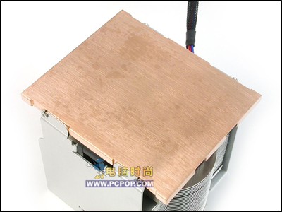 U80的底部采用了全铜材料,并且面积很大,几乎和P4处理器的支架面积一样,并且从图中我们可以清楚地看到其工艺为拉丝技术,表面非常的光滑,这大大提高了底部的瞬间吸热能力,并且以最快的速度将热量传递给两根热管。