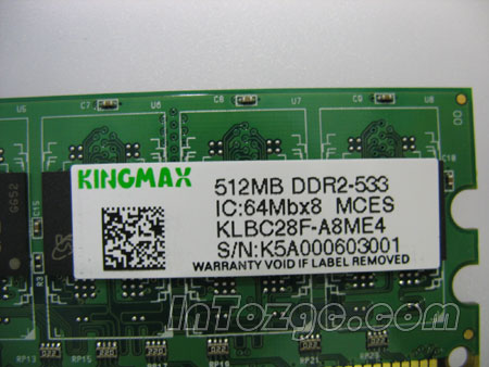 与Kingston一样,Kingmax同样是内存界的知名品牌之一。其产品整体做工严谨扎实,并采用了蛇形布线和145边角处理,很好保证了信号传输的稳定性。微型贴片电容和“8PIN”电阻排装贴整齐,焊点均匀饱满,看得出是大厂出品。