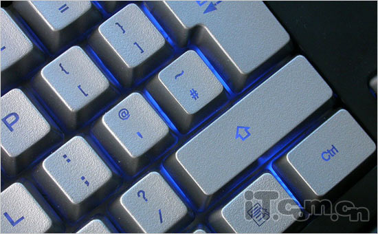 Eclipse键盘采用了标准的104键,而且还带有可调节式腕托,即便长时间游戏也不会产生手腕肌肉疲劳。其按键上的字母使用激光切割,当打开背光灯时灯光可以通过按键上的字母透上来。而且方向键的上方多了一个Eclipse的Logo。整体上相当的酷。