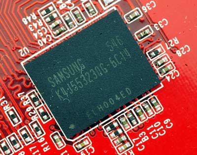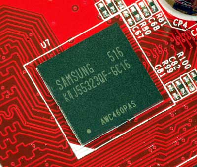 显存上,采用了了三星 1.4ns GDDR3 显存, 128M 128BIT 显存容量规格,显存位宽方面虽然是 128BIT ,但是却整合了两条 128bit 环行通道。然后这两个通道由 4 组内存控制器来负责控制;这两条环行通道采用了闭合单工设计,也就是说其工作的时候只会朝一个方向传递数据,理论上数据带宽就扩展了一倍,达到了 256bit 。
