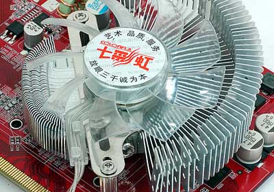 七彩虹天行 6600GT CT 超频 版 风扇由众多散热鳍片折叠构成,这种结构不仅可以有效地增加散热面积,而且与散热片接触部分使用的锡焊接工艺,可令导热效果更为良好。配合使用的滚珠风扇,不仅使散热效果大幅得以提高,静音效果十分明显。