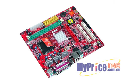 扩展性方面,整合了显示芯片的主板仍提供了一条AGP 8X插槽,便于用户升级更为强劲的独立显卡;出于板型的限制,仅仅提供了两个PCI插槽。这款主板集成有微星自己的监控芯片,集成的功能模块还包括瑞昱的百兆网络芯片,以及6声道音频芯片。