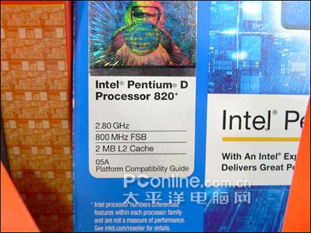 Pentium D 820同样采用0.09um工艺,使用的是SmithField核心,比起Prescott在发热量上有了相当改善,但功耗仍然较高。Pentium D 820的两颗核心运行频率都为2.8G,而每颗核心拥有1 ML2二级缓存。PentiumD于8月份正式在国内市场上市,其中频率最低的PentiumD 820是价格较低,早期上市时卖2399元,而现在只需要2100元附近,比起竞争对手AMD Athlon64 X2 3800+双核处理器2700元附近的售价,Pentium D 820要更具性价比一些,先前的话只是945/955两个自家芯片组才能支持,令人欣喜的是现在VIA、ULI、ATI和NVIDIA的芯片组都陆续加入了双核处理器的支持。