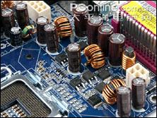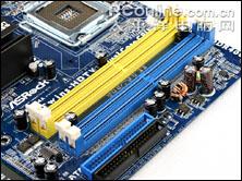 主板采用扎实的3相供电,但是主板电源接口还是旧规格20Pin的设计,毕竟这款主板的定位是低端市场,相信用于搭配64位赛扬D或P4 506+等中低端处理器不成问题。板上设计了4条内存插槽,分别是黄色的DDRII667和蓝色DDR400内存槽。