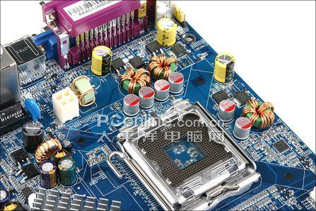 主板CPU供电部分采用了完整的三相供电设计,电容部分采用固态和直立式电解电容相结合,CPU底座四周的元件全部采用矮身设计,方便用户安置大型的LGA775散热器。板载两条DDR2内存槽,最高支持2GB DDR2 667,本地内存扩展,仅支持单通道功能。不过跟上一代的整合芯片组相比,由于引进了DDR2即使是单通道频宽,对于赛扬D来说仍然应付有余。