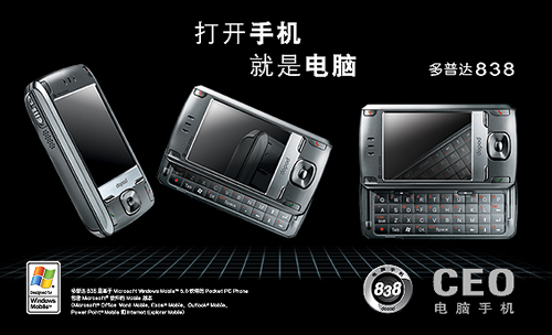 多普达 838采用了在普通手机当中都比较罕见的侧滑造型,采用Windows Mobile5.0操作系统,内置侧滑QWERTY键盘,便于用户输入文字。还内置Wi-Fi无线网络,是个办公商务的好帮手;配备了2.8英寸,材质为65k色的QVGA(240×320)分辨率可触摸TFT屏幕并配有效像素为130万的摄像头;可以支持将MP3、WMA、WAV、MIDI等格式的音乐设置为来电或短信铃音;内存是128ROM+64RAM的配置,不算大,但支持miniSD存储扩展卡功能;内置红外蓝牙,方便做遥控器和数据传输。