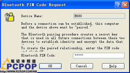 之后,我们要在电脑提示的“Bluetooth PIN Code Request”内快速地输入刚才在手机上输入的识别码,再按下“确定”键。