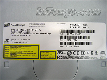 根据标签我们可以看到这款刻录机真正的型号为GSA-4166B,据小编了解这款刻录机应该是韩国LG电子首次发布的带有光雕的的刻录机,看来光雕技术也是今年必将流行的一个潮流。