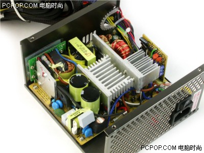 将电源的外壳打开后,我们首先可以看到电源的内部用料很足,甚至连散热片都比过去常见的电源要厚实一些。