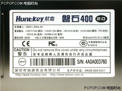 从电源的铭牌上的功率参数方面我们可以清楚的看到这款电源的两路+12V输出分别为10A和15A,完全可以应付目前或未来主流平台对+12V的需求。这款电源通过了多项认证,其中包括了国内必须强制实行的3C认证。可以说这款磐石400在做工和用料方面秉承了航嘉磐石系列电源一贯的高品质,同时又采用了最新的INTEL ATX 12V 2.0规范,提供双路+12V输出。无论是应用在入门级服务器方面,还是高端家用电脑方面来说都是非常不错的选择。