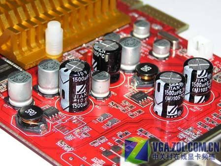 微星Radeon 9550“小强版”采用了惯用的火红色PCB板,整块布线合理,用料充足,核心与显存供电电路中全都采用高档高档电解电容,保证显卡在400MHz/核心频率、550MHz/显存的高频率下稳定运行。这款显卡可以达到480/680的高频率,考虑此卡仅仅使用了散热片被动散热相信更换散热器以后还有进一步提升的空间。有趣的是此卡安装后会被自动识别为9600XT。